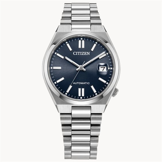 Orologio Automatico solo tempo Unisex Citizen modello Tsuyosa 37. Cassa acciaio lucido e satinato fondo a vite con vista movimento, corona posizionata a ore 4. Movimento Meccanico Automatico Citizen 21 rubini , 21.600 oscillazioni all'ora , riserva di carica 40 ore. Vetro Zaffiro antigraffio con lente sulla data. Quadrante blu indici e lancette luminescenti , data ore 3. Bracciale acciaio regolabile , chiusura deployante con pulsanti. Impermeabile 5 atm. Scatola e Garanzia 5 anni originale.