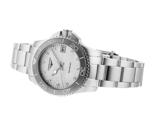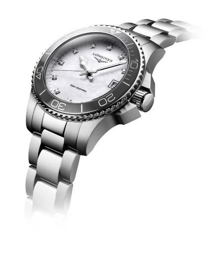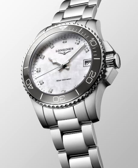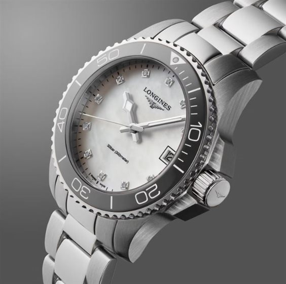 HYDROCONQUEST, L3.370.4.87.6, orologio Al Quarzo, Ø 32.00 mm, Acciaio inossidabile e lunetta in ceramica. Date. Corona a vite Lunetta girevole unidirezionale, Impermeabile fino a 30 bar, Vetro zaffiro antigraffio con trattamento antiriflesso multistrato su entrambi i lati. Quadrante Madreperla bianca, Swiss Super-LumiNova®. Bracciale in Acciaio inossidabile, Con chiusura déployante a doppia sicurezza.
